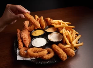 Menú variado: hamburguesas, alitas, acompañamientos, bebidas.